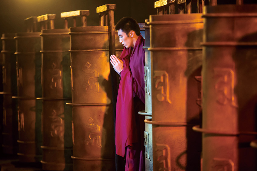 扮演倉央嘉措的是就讀于解放軍藝術(shù)學(xué)院的學(xué)生黃琛迪。丁偉說:“我跟很多知名演員都有過接觸,但是每個人都很忙,有好多錢要賺,沒有一個靜下心來的狀態(tài)。而這個演員的眼睛很干凈,還沒有被名利、榮譽侵擾。我們把他帶到藏區(qū)去采風(fēng),臨走時他提出想到寺廟里住一段時間。我們到了甘肅夏河倉門寺,他在那里和僧人們一起生活,每天看他們誦經(jīng)。他逐漸進入狀態(tài),慢慢體會到了倉央嘉措的精神世界?!?/p>