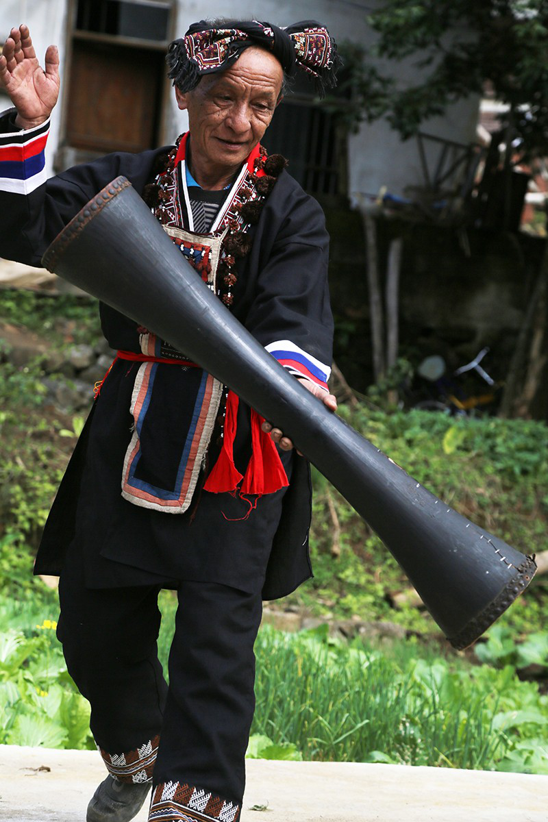 聽罷門唻歌,再賞羊角長鼓舞。轉鼓、跨步、收腿、回腰、碰角……這套由多人合作的舞蹈,動作粗獷,節(jié)奏明快,舞者配合默契,音韻鏗鏘。今年66歲的老藝人盤福貴,舞起祖宗留下來的已有一百多年歷史的羊皮長鼓,身手矯健、動作敏捷,讓人驚嘆不已。盤福貴的爺爺、父親都是跳羊角長鼓舞的高手,父親把這項技藝傳授給他,如今他又收女兒和孫子為徒,已是五代傳承了。