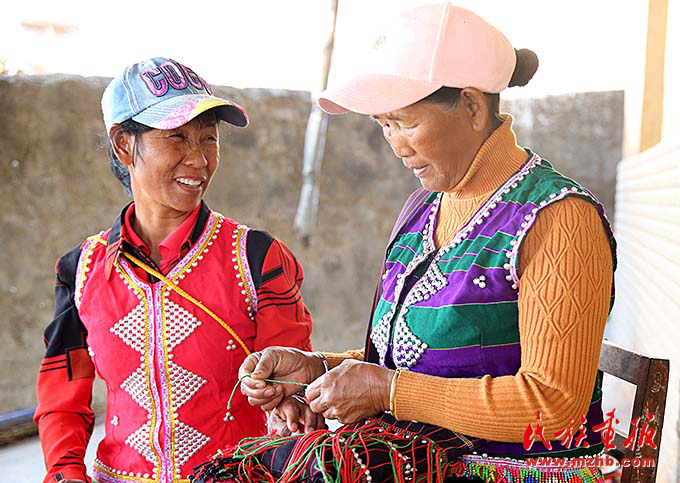 在娜巴來(lái)家,兩位表姐正在繡佤族服飾背包