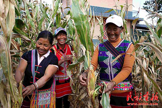 娜巴來(lái)三姐妹在苞谷地里愉快地采摘苞谷,身后就是新房子