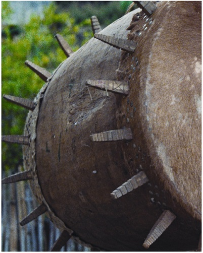 民族文化宮博物館藏基諾族木質(zhì)皮鼓,鼓面直徑55厘米,高88厘米,長(zhǎng)約130厘米,20世紀(jì)八十年代征集于云南省西雙版納州景洪縣基諾鄉(xiāng)。鼓身為木質(zhì),呈圓柱形,兩端對(duì)稱。鼓有兩面,用牛皮蒙制。兩端鼓面邊緣各環(huán)繞嵌有花紋的上方下錐形的木棍(一側(cè)17根,另一側(cè)為20根),木棍長(zhǎng)15厘米。鼓身兩側(cè)有方形孔,為鼓的音孔,上部有兩個(gè)把手,用于系繩懸掛木鼓。因鼓面兩端邊沿嵌有數(shù)十根鼓釘,形似太陽(yáng)放射出的光芒,也稱為“太陽(yáng)鼓”。
