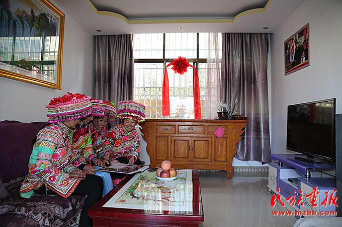 搬到新村后,村民們的生活多了幾分樂趣。村民張曉倩(右二)拿出自己的結(jié)婚照與姐妹們分享這個幸福的瞬間