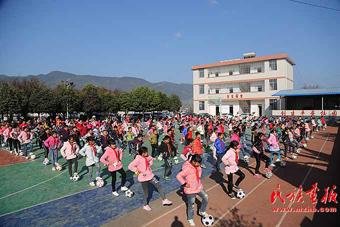 在新村聯(lián)排別墅的最南邊是中村鄉(xiāng)小學,這所學校是同傈園新村相依而伴建在一起的。上午十點,課間操的鈴聲打破了新村的寧靜。學生們歡快地沖出教室,每人手捧足球,來到操場。在老師統(tǒng)一的號令下,孩子們跳起了足球課間操。歡快的音樂旋律,伴著運球、帶球等不同的動作,孩子們的天真爛漫得到了充分詮釋。小學校長張世喜看著學生們歡樂的表情,高興的表情溢于言表。他說:“孩子們太幸福了?!?6年前,張世喜從楚雄師院畢業(yè)回到了家鄉(xiāng)的中村鄉(xiāng)峨山村委會小學,“場是土巴地,籃球架是用兩棵大樹做成的,教室里的桌椅高矮不一,找不到品相相同的兩張課桌,孩子們的宿舍是兩三個人擠一張床……”回憶起那時情景,張世喜記憶猶新。 “現(xiàn)在好了,住宿生縣財政每月每人都要補貼100元伙食費,孩子們頓頓有肉吃了,還為我們建起了兩棟宿舍樓,268名住宿生每人一張床,再也不用擠著睡了。”張世喜說,在這樣的辦學條件下,我們工作越來越有激情了。