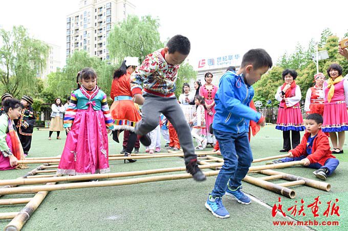 每次活動日,學(xué)校都會從民族傳統(tǒng)游戲中梳理出十多個(gè)符合幼兒年齡特點(diǎn)、有助于幼兒身心發(fā)展的游戲內(nèi)容,因地制宜轉(zhuǎn)化成有趣的幼兒民間運(yùn)動游戲。在游戲中,既讓孩子們體驗(yàn)了運(yùn)動樂趣,又傳播了民族知識。這些富有童趣的游戲,深受孩子們喜愛。