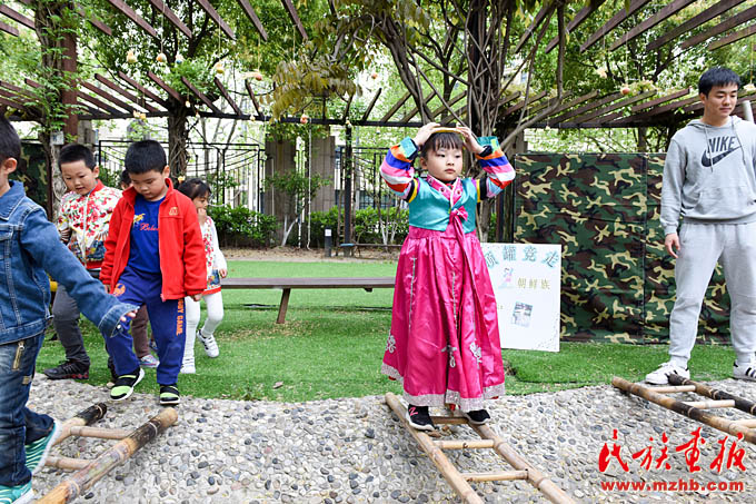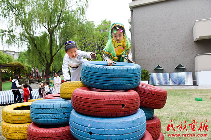 畬族的“摘柿子”、維吾爾族的“賽馬”、黎族的“跳竹竿”、蒙古族的“射箭”……天恒名都幼兒園的操場上,孩子們正積極參加各種民族游戲活動,沉浸在無憂無慮的快樂中。4月13日,是上海市莘莊工業(yè)園區(qū)天恒名都幼兒園的“民族接力棒小社團(tuán)”活動日,孩子們非常期盼這每周一次的活動日。