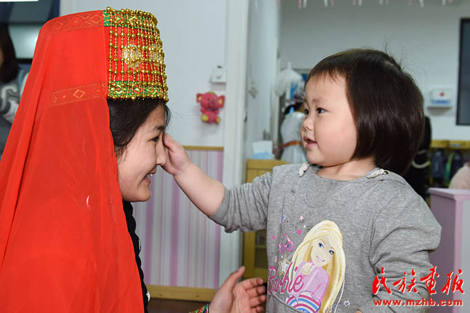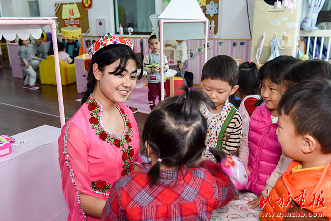 自2014年首場“民族風(fēng)吹進(jìn)幼兒園,愛心曲唱暖身邊人”公益活動獲得積極反響后,幼兒園黨支部、工會、團(tuán)支部牽手園區(qū)民族團(tuán)結(jié)共建單位,走出校園、貼近社區(qū),以愛心義賣、義拍、定向捐助等方式為園區(qū)少數(shù)民族困難家庭送去關(guān)懷。在近幾年的園區(qū)民族工作實(shí)踐中,天恒名都幼兒園的“家、校、社、企”聯(lián)動模式不斷發(fā)展創(chuàng)新,培育孵化出少數(shù)民族(幼教)實(shí)習(xí)點(diǎn)、少數(shù)民族志愿者服務(wù)隊(duì)等形式的實(shí)習(xí)模式。2013年至今,幼兒園已為上海市群益職業(yè)技術(shù)學(xué)校的“新疆班”學(xué)生210人次提供了實(shí)習(xí)崗位。