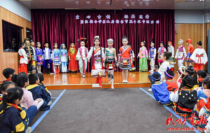 同一天下午,一場精彩的T臺秀在上海市閔行區(qū)梅隴鎮(zhèn)弘梅小學(xué)上演。小學(xué)生們身著民族服裝亮相,動感的音樂、精彩的表演,將“民族團(tuán)結(jié)一家親”的理念演繹得生動活潑。學(xué)校布置的民族文化墻上,展示了我國56個(gè)民族的風(fēng)土人情,營造了多姿多彩的民族文化氛圍,讓民族特色文化陪伴在學(xué)生身邊。