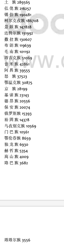 本規(guī)劃所稱的人口較少民族是指全國總?cè)丝谠?0萬人以下的28個民族。這些民族是:珞巴族、高山族、赫哲族、塔塔爾族、獨龍族、鄂倫春族、門巴族、烏孜別克族、裕固族、俄羅斯族、保安族、德昂族、基諾族、京族、怒族、鄂溫克族、普米族、阿昌族、塔吉克族、布朗族、撒拉族、毛南族、景頗族、達(dá)斡爾族、柯爾克孜族、錫伯族、仫佬族、土族。