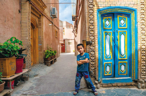 江庫爾干巷最美的門,人們都愛在此留影。上午12點,斑駁的陽光灑在門上,瓦力小朋友跳到鏡頭前學著電影中的人物姿勢,讓我給他拍照片。