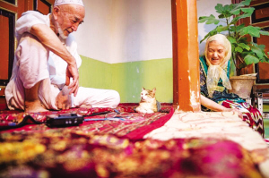 20多年前的喀什古城,老舊巷道縱橫交織,衛(wèi)生狀況較差,一些大膽的老鼠不論白天黑夜在巷道里亂竄,很多人家養(yǎng)貓是為了對付老鼠。如今走在改建后的古城里,所到之處窗明幾凈,而這里的貓從捕鼠者變?yōu)榧彝櫸?。貓已適應角色轉變,愜意地享受著暖暖的羊毛毯。老兩口對寵物貓像對自家的孩子一樣呵護備至。