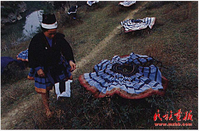 畫好的白布放進盛有牛膠和藍(lán)靛的缸里浸染7— 10天,當(dāng)布匹染成深藍(lán)色時拿出,再放入盛有草木灰的熱水中,用灰水將粘膏脫去,清水洗凈后晾干,就成了一塊有白色花紋的蠟染布。白褲瑤婦女在白色的花紋上繡上彩色的絲線,再把三幅繡有圖案的布連成一塊4米長的裙布,在裙腳邊上縫上一條手掌寬的黃色蠶絲,最后用2 條棉繩穿過裙頭勒緊,百褶裙就做成了。一條百褶裙從紡線到完成據(jù)說需要兩到三年的時間。