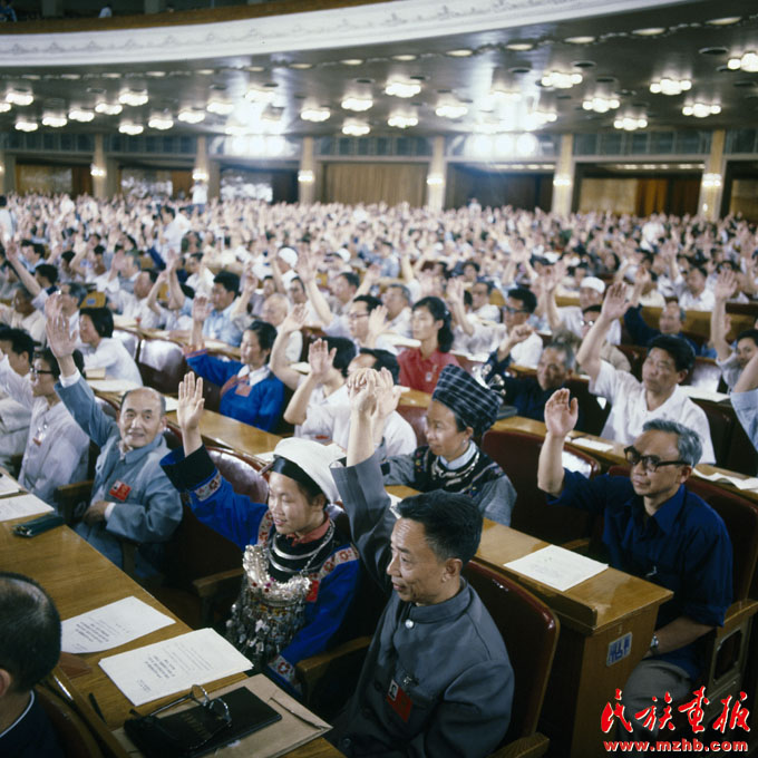 1984年5月31日,中華人民共和國第六屆全國人民代表大會第二次會議通過了《中華人民共和國民族區(qū)域自治法》,自1984年10月1日起施行。民族區(qū)域自治制度是我國的一項基本政治制度。圖為各族代表舉手表決通過《中華人民共和國民族區(qū)域自治法》《民族畫報》2009年慶祝中華人民共和國成立60周年???/p>