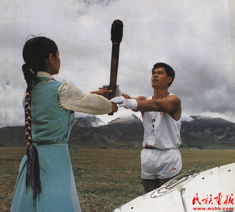 1990年,象征著亞洲30億人民“團結、友誼、進步”的第十一屆亞洲運動會在中華人民共和國首都北京隆重開幕。8月7日,在西藏的念青唐古拉峰下,藏族少女達娃央宗點燃火把,傳遞給前世界冠軍、“體操王子”李寧(壯族),李寧接過圣火,點燃了火種盒內(nèi)的火種《民族畫報》1990年第11期