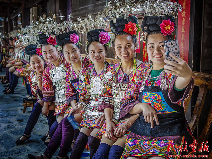 經(jīng)歷改革開放40年的發(fā)展,我國社會生產(chǎn)力、綜合國力、人民生活水平實現(xiàn)了歷史性跨越,全黨全國各族人民要更加緊密地團結在以習近平同志為核心的黨中央周圍,高舉中國特色社會主義偉大旗幟,不忘初心,牢記使命,將改革開放進行到底,不斷實現(xiàn)人民對美好生活的向往,在新時代創(chuàng)造中華民族新的更大奇跡。圖為貴州民眾盛裝自拍?!睹褡瀹媹蟆?018年第3期