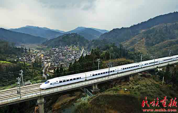 改革開放40年來,少數(shù)民族和民族地區(qū)成為改革開放的切實(shí)受益者,2017年1月1日,滬昆高鐵線上的列車沐浴著新年的陽光飛馳在云貴高原上(史家明 攝影)