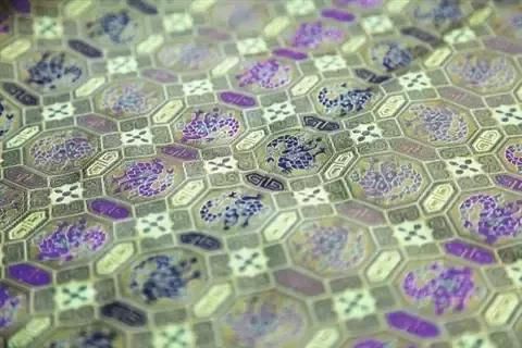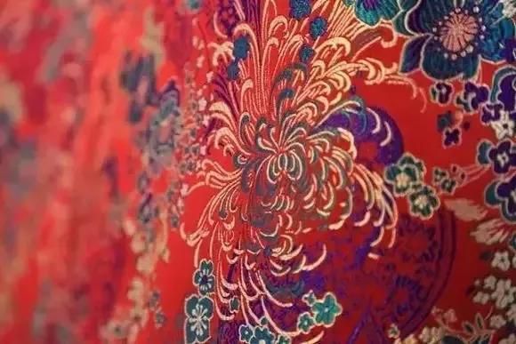 南京云錦大量使用金線,逐花異色,質(zhì)地堅實,花紋渾厚優(yōu)美,色彩濃艷莊重。配色運用 “色暈 ”層層推出主花,且從云錦的不同角度觀察,繡品上花卉的色彩是不同的。
