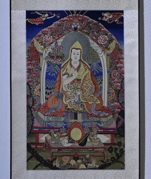 本作品的主體是藏傳佛教格魯派創(chuàng)始人宗喀巴。豐富的層次,飽滿的花紋,使其成為獨具風(fēng)格的高檔全真絲宋錦唐卡。