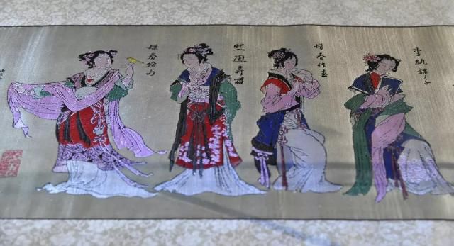 取材于唐代畫家張萱的畫作《虢國夫人游春圖》和《簪花仕女圖》,作品采用橫織豎裱的方式呈現(xiàn)。