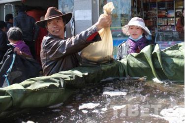 在當(dāng)?shù)厮幫跎睫r(nóng)貿(mào)市場可以看到,很多信眾或帶著器皿或拿著塑料口袋前往水產(chǎn)店買魚放生。甚至有的信眾開著一輛面包車,車廂用塑料包裹,里面裝滿水,載著買來的一整車魚前往拉薩河放生。 “薩嘎達(dá)瓦節(jié)期間,魚賣的特別快,藏歷十五的時(shí)候我們的魚都被買光了?!彼a(chǎn)市場的李老板說。