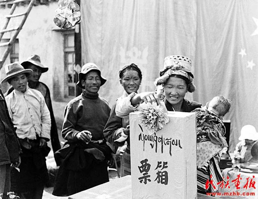 1962年7月,山南地區(qū)乃東縣昌珠鄉(xiāng)的翻身農(nóng)民巴桑卓瑪穿上新衣到選舉鄉(xiāng)人民代表的會(huì)場(chǎng)參加投票,她興奮地投下了幸福的一票(蘇俊慧 攝影)