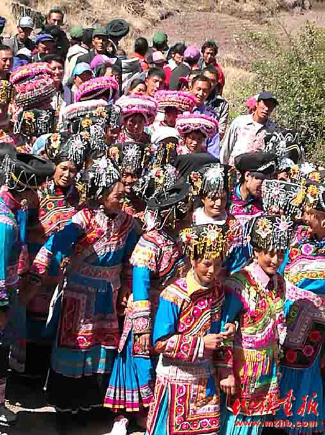 娶親要請客,當(dāng)?shù)乩圩逭埧椭恍杩陬^傳話,凡是知道的親戚朋友都會來參加。娶親隊伍主次兩位主婚人,伴郎伴娘各一人,背新娘和嫁妝的二人,接親的四至六人,其中有一至兩個歌手,一行十二人組成。帶著早已為新娘準(zhǔn)備好的花短衣、長裙、銀手飾、圍腰鏈、銀泡、銀項等飾物興高采烈地從新郎家出發(fā)。