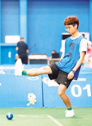 江西隊(duì)選手在混合雙蹴比賽中起腳擊球 何五昌攝