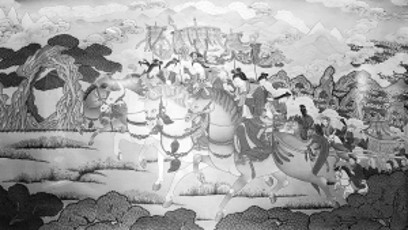 《文成公主進(jìn)藏》及其細(xì)部。規(guī)格:100厘米×60厘米,創(chuàng)作時間:1985-1993年,作者:夏吾才郎、更登達(dá)吉。這幅作品由夏吾才郎構(gòu)圖,更登達(dá)吉及徒弟上色完成。整幅作品生動寫實、布局嚴(yán)謹(jǐn)、色彩淡雅、遠(yuǎn)近相應(yīng),呈現(xiàn)出廣泛的視覺空間。 解加馨于供圖