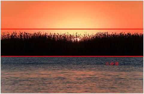有的人可能就會問,地平線或者海平面的這個線,到底是放在哪條線上比較合適呢?主要原則可以稱為“頂天立地”,如果地面上的內(nèi)容比較精彩的,就把這個地平線放得高一些,就是放到上面的1/3,也就是從上面數(shù)的第一條線上。如果天空的內(nèi)容比較精彩的,比如說日出日落、彩霞滿天,地平線就放得低一些,放在最下面這條線上。