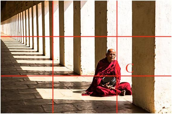 這三張圖都是就是黃金交叉點構(gòu)圖的應(yīng)用,第三張是在緬甸的拍的,當時這個僧人坐在有光的長廊里,他的頭不在交叉點上,但落在相對差不多的位置。
