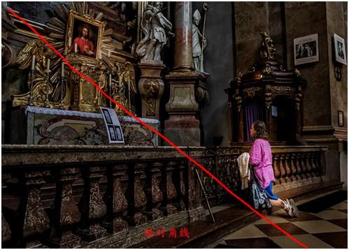 我們看到下面這張圖也是以對角線的構(gòu)圖形式,只不過這個對角線從畫面中明顯的看不出它是一個對角線,而是畫面中一些重要元素形成的一個對角線趨勢,我們暫且把它稱之為暗對角線。