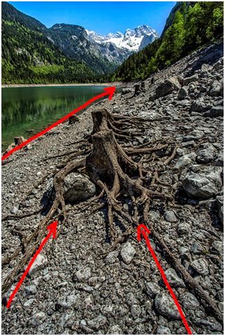 這個片子的興趣點是樹樁,樹樁根系和湖岸形成的引導線,把我們的目光從樹樁根系一直在往前推,一點點推到雪山,并不是跳躍性的看到雪山。觀者進入畫面是一個逐步的過程,是一直有引導線引導著你,最后看向了遠處的森林和雪山。