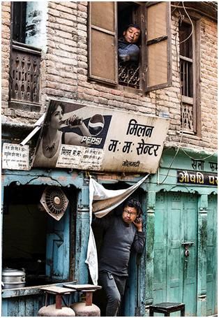 上面這兩張圖第一張,歸類為半包圍。第二張圖也是半包圍,在尼泊爾的一個小鎮(zhèn)拍的,旁邊兩個人是背影,實際上把這個人夾在中間,所以這個人特別容易引起你的注意,形成了一種包圍趨勢,在電影的鏡頭語言中運用的比較多。