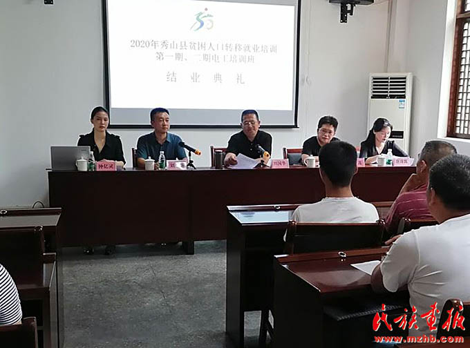 2020年6月29日,鐘億靈(左一)出席在清溪場鎮(zhèn)武陵山致富帶頭人實訓基地舉行的秀山縣2020年貧困人口轉(zhuǎn)移就業(yè)培訓第一、二期電工培訓班結(jié)業(yè)典禮。(秀山縣人民政府網(wǎng))