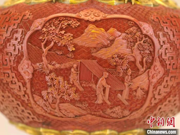沈陽故宮博物館敬典閣館藏珍寶展展廳展出的乾隆款剔紅開光山水人物紋龍耳瓶。 沈陽故宮博物館供圖