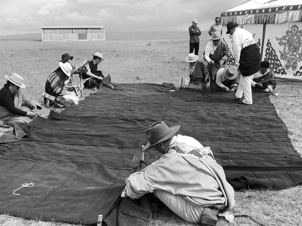 黑牦牛帳篷的主要材料是牦牛身上最粗的毛,顏色一律用黑色,外觀上不加任何裝飾,一頂帳篷一般可容納六七人。制作黑牦牛帳篷一般需經(jīng)過剪毛、梳毛、捻線、卷線、鋪線、編織6道工序,篷內(nèi)用兩根立柱頂起橫梁,四周頂部的8根牦牛繩末端拽緊于對應的木橛子上,并且用圓木桿撐起,篷頂設有可隨意啟閉的長方形天窗,以供通風采光、散煙,防止雨雪灌入。篷頂與四壁交接處的四角和四邊的中部各縫有一根長繩,一般是結(jié)實的牛毛繩或牛皮繩,用于固定帳篷。帳篷的“門”大多是左右?guī)ぁ氨凇敝丿B合攏充當,有時是一道可掀開的簾子,平時合上,進出掀開。