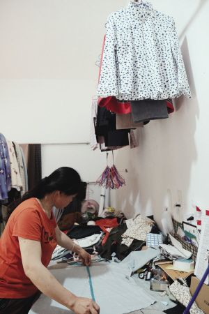 頭頂懸掛著制好的衣服,裁縫阿姐手上開始測量下一件的尺寸。