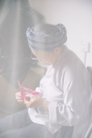 后來,我好幾天都到黃奶奶家,希望她可以染布給我看,但似乎總是機(jī)緣不到。一天,在黃奶奶家午睡醒來,隔著蚊帳,看見她側(cè)對著我正在繡花,沉浸在一片溫柔的光暈里。那是黃奶奶的另一項手藝,繡有龍鳳、獅子、蝴蝶、花朵、螃蟹這些吉祥花紋的繡片,會用在小孩背帶上,保佑他們健康長大。家里每個出生的成員都受到美和愛的環(huán)繞。