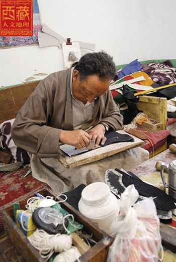 坐在工作臺上的赤列塔青,身材高大,穿一身合體的淺色藏裝,前擺上沾著幾星鼻煙,長期用針的手指有些變形。翻開他的履歷發(fā)現(xiàn),赤列塔青可以說是拉薩少有的制靴世家,他的父親邊巴頓珠在舊社會是個給人支差的貧苦鞋匠,靠給有錢人修鞋、做鞋為生。今年68歲的赤列塔青性格沉穩(wěn)、做事穩(wěn)健,他12歲當學徒工,做鞋做了56年,如果再加上父輩的修鞋歷史,時間更長。在今天的拉薩有這樣經(jīng)歷的人算是屈指可數(shù)了。赤列塔青從小就在父親和師傅身邊打下手,逐漸掌握這個足以養(yǎng)家糊口的一技之長,終于成長為一個勤奮而多才的手工藝人,開始了穩(wěn)坐一隅的匠人生涯。