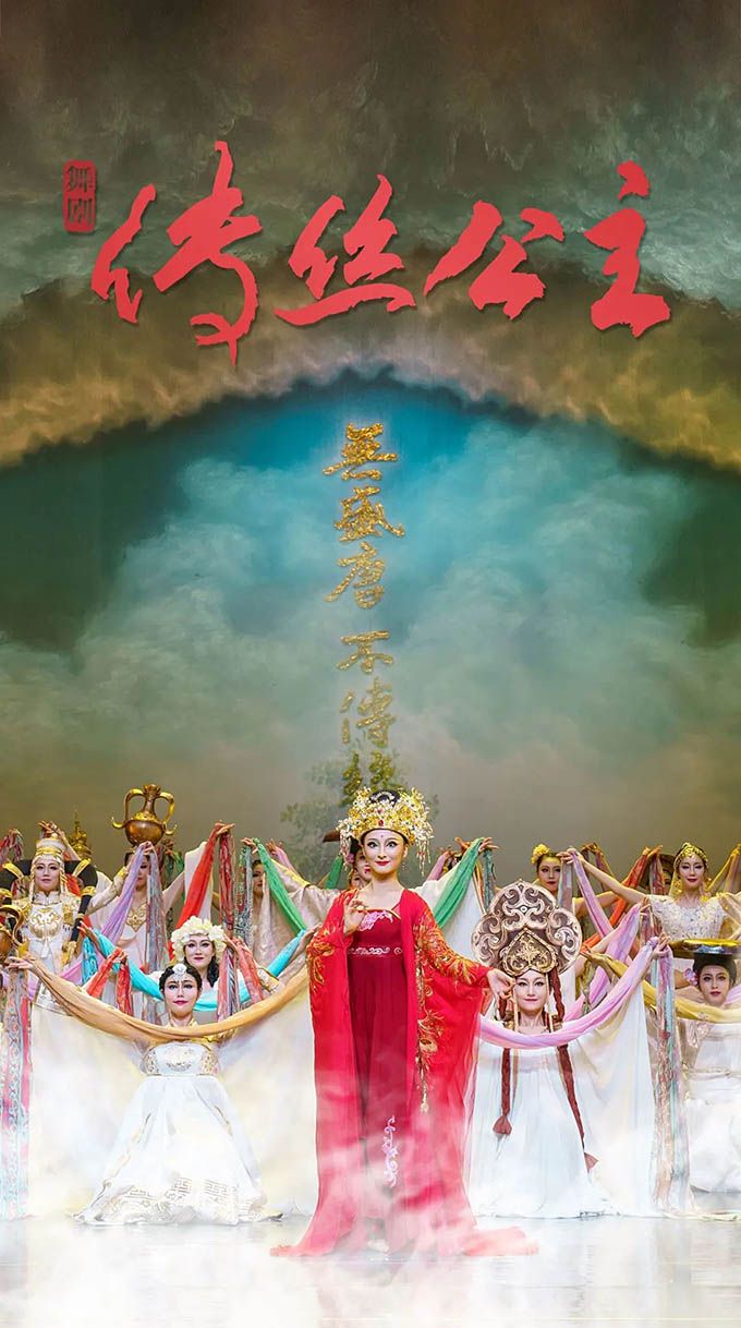 《傳絲公主》以唐朝玄奘《大唐西域記》中“瞿薩旦那國”(今新疆和田地區(qū))一條關(guān)于蠶種西傳的史料記載為依據(jù),以新疆丹丹烏里克遺址發(fā)掘的唐代木板畫“傳絲公主”的文物遺存為印證,以于闐王子與唐朝公主將東方蠶桑絲綢首傳西域的故事為載體,再現(xiàn)了1300年前我國各民族文化上兼收并蓄,經(jīng)濟上相互依存,情感上相互親近,在互鑒融通中匯聚成多元一體的中華民族的歷史。