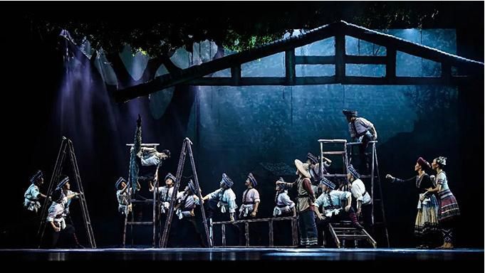 “花腰帶”既是精美的舞蹈道具,又是劇中人物情感的寄托,在整部舞劇中反復(fù)出現(xiàn)。特別是在雙人舞中,“花腰帶”將人物間無形的關(guān)系幻化成有形的聯(lián)系。劇中的蘆笙舞段,不僅僅是男女之間情愛的表達(dá),更突出表達(dá)了“開山人”為了讓窮鄉(xiāng)告別貧苦,為大愛舍小愛、努力奮斗的決心,以及對美好生活的向往。傳統(tǒng)民族舞蹈在這部劇中被賦予了不同的含義。