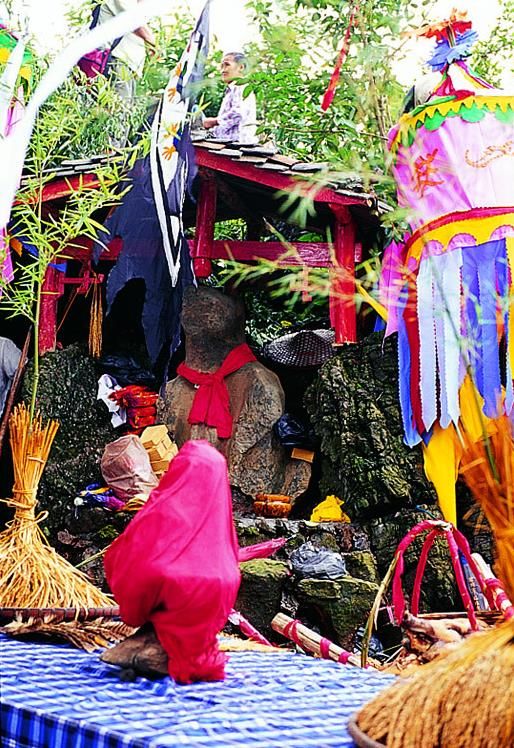 敬霞儀式在霞堂舉行。霞堂設(shè)有祭壇。壇前立著一根竹竿,竿頂上站立一只公雞。祭壇中是主祭席,其友有用松針鋪成十二個(gè)祭祀點(diǎn),由宗族各支系擺設(shè)祭品。敬霞這天,各支系由德高望眾者領(lǐng)隊(duì)。抬著豬肉、糯米飯、米酒等食品列隊(duì)進(jìn)入霞堂。一路上銅鼓、銅鑼、欽、革鼓被敲得冬嚏冬嚓地響,人們跟在后面吆喝著前進(jìn)。祭典開始,鑼鼓暄天。接著由執(zhí)壇的水書先生念讀敬霞的祝詞,內(nèi)容多為祈福禳災(zāi),期冀風(fēng)調(diào)雨順,人壽年豐之類。祝詞之后便酪酒祭之:此后,由兩個(gè)身穿白衣的小伙子抬一母豬到田壩中繞行,后面那位不時(shí)用松針刺戳豬的尾部,使它發(fā)出嗥叫聲。圍觀的人常常發(fā)出哄笑,并且盡情地用竹片屏水和撮稀泥向抬豬者灑淋過去。走過霞堂之后,抬豬者丟下母豬,故意穿進(jìn)圍觀的人群,嚇得人們四處躲避。這種逗趣結(jié)束之后,水書先生再度念讀咒詞,當(dāng)他手中的執(zhí)法彩杖一揮時(shí),飼雞者便學(xué)雞嗚,逗引竹竿頂上的公雞啼鳴。這時(shí),主祭者就向眾人高呼:等待霞神降雨來(lái)沐浴。此后,水書先生再念祝詞,又酹酒祭之。然后由各族系代表抬著"酒壇去澆灌"霞神"。人們用酒從頭澆到腳,一直澆到"霞神"們倒(象征酒醉)才算祭祀的成功。