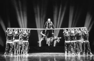在靜謐的夜空下,首先映入觀眾眼簾的是群舞演員在舞臺(tái)中央,用身體構(gòu)建的人字形“情人房”。房內(nèi)的瑤族姑娘正在小憩,或許是被屋外的動(dòng)靜驚醒,她推門出外察看,重重的門軸聲劃破了夜的寂靜,原來是愛慕者正攀在一根竹竿上向自己示愛。“無竹不成瑤”,舞蹈伊始,最核心的道具——一根長約8米、杯口粗的竹竿就出現(xiàn)了。借助竹竿,群舞演員通過造型組合及隊(duì)形變換,不斷再現(xiàn)生活場景:山坡上、小橋上、屋檐下、窗欞邊……情隨景遷、情景交融,生活圖景和人物情緒巧妙地融合在一起,營造出一種別樣的意境,極大地引發(fā)了觀眾的聯(lián)想。