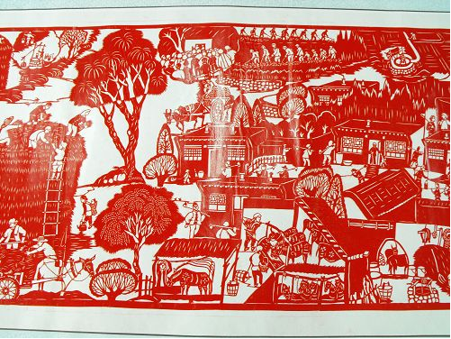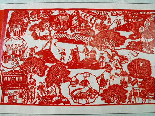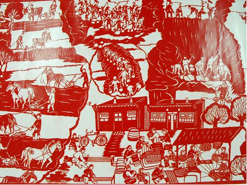 2、達(dá)拉特紀(jì)事剪紙的歷史價(jià)值很高,《農(nóng)民紀(jì)事圖》上卷記載了從建國到現(xiàn)在農(nóng)村的發(fā)展變化,在作品中我們看到了很多瀕臨失傳的農(nóng)村生產(chǎn)生活工具和生產(chǎn)方法,也能看到黨和國家在每一年出臺的各項(xiàng)惠農(nóng)利民政策,對于研究歷史具有重大的文獻(xiàn)價(jià)值。