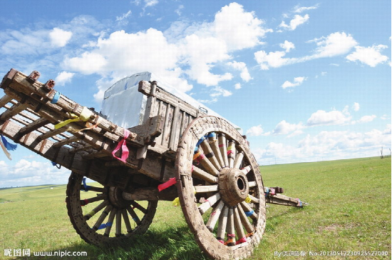 蒙古族牧民常用的一種木制大輪車。多用樺木或柳木制做。車輪高約1米,車身重約百斤,可載重300—450公斤,日行約30余公里。每車用一頭牛來拉,一人可駕馭數(shù)輛,適于在草原、沙漠、雪地等行走。亦可將數(shù)十輛勒勒車首尾相接形成近百米長的車隊,十分壯觀,也形成了草原上特有的風(fēng)情?,F(xiàn)在已多被膠皮鐵輪的軸承車所替代。另外還有一種“蒙古轎車”,是一種在勒勒車基礎(chǔ)上經(jīng)過改造專門乘人的車。其與勒勒車不同之處在于車體上有用柳條子彎曲后扎成的車棚,棚子的外面用毛氈包圍,形成一個既擋陽光,又擋風(fēng)雨,防曬御寒的帳篷。
