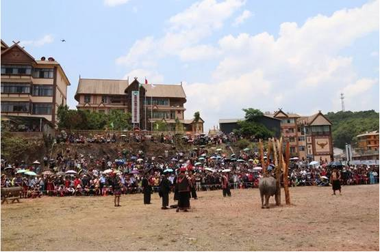 剽牛是佤族祈求神靈保佑,人們安居樂(lè)業(yè)、吉祥如意、幸福安康的一種傳統(tǒng)祭祀活動(dòng),同時(shí)他們也認(rèn)為這是與神靈鬼魂溝通的最有效方式?!柏狻弊殖浞煮w現(xiàn)了剽悍、敏捷而勇猛的含義?,F(xiàn)在剽牛樁上已經(jīng)拴好了要舉行剽牛祭祀的水牛,各鄉(xiāng)鎮(zhèn)群眾已經(jīng)陸續(xù)就位,讓我們一起去領(lǐng)略佤族狂野的剽牛祭祀吧!