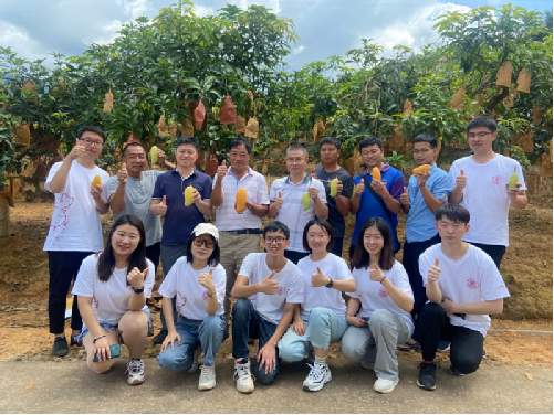 一是恩樂鎮(zhèn)復興村晚熟芒果基地調(diào)研。9月3日上午實踐團前往恩樂鎮(zhèn)復興村晚熟芒果基地考察,了解該基地的主要栽培品種,提出當?shù)孛⒐耘嗟膬?yōu)勢及目前亟需解決的問題,并為農(nóng)戶進行相關(guān)栽培技術(shù)的講解,為當?shù)赝硎烀⒐毣芾硖峁┘夹g(shù)支撐。同時實踐團選取不同海拔生長旺盛、豐產(chǎn)、穩(wěn)產(chǎn)的成年樹,隨機采摘果形均勻、健康飽滿、無機械損傷和病蟲害的成熟果,以及套上不同果袋子的果實,如白袋、紅袋和黃袋,所有樣品采摘后立即送回實驗室,對其單果重,果實縱徑、橫徑、厚度、總可溶性固形物、果形指數(shù)及風味等綜合性狀進行測定,探究不同海拔和果袋對芒果果實品質(zhì)的影響,以期為生產(chǎn)實踐提供理論指導,提高果實品質(zhì)。