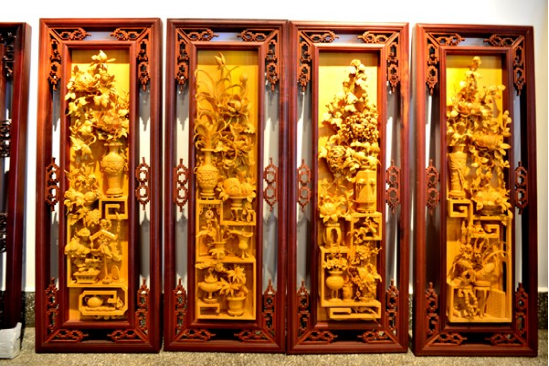 《四條屏掛件》脫胎于“格子門”的上裙板,是由實用到觀賞的一種很好的轉換,是目前最走俏的新產(chǎn)品,無論是賓館客廳或居家,古樸典雅的木雕“四條屏”會增添不少東方文化的雅趣,越來越受到人們的喜愛,許多人都把它作為木雕藝術珍品收藏。為了給世人留下藝術精品,許多工藝師潛心研究設計、精心雕刻,用半年、甚至一年多的時間才完成一件“四條屏”。這些精心之作,疏密有致、變化統(tǒng)一,構圖飽滿,穿插纏繞,重重疊疊的層層透雕,無不凝聚著制作者的智慧與心血。《四條屏》的圖案設計,主要有三種內(nèi)容:(1)博古;(2)花卉;(3)花鳥。人物、山水類型的極少。圖案喻意與格子門相近。