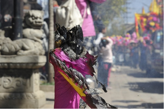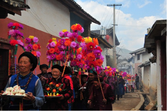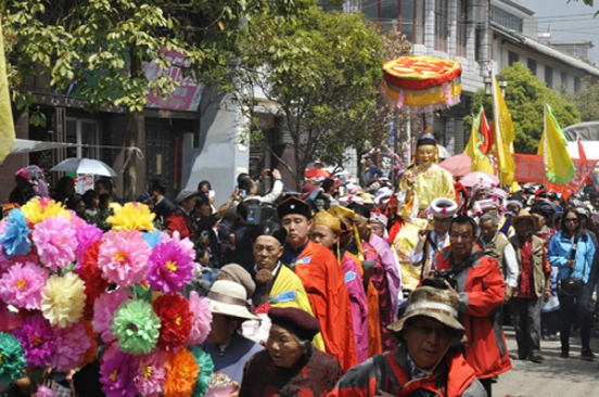 農(nóng)歷二月初六,迎太子入城。這一天在佛教徒的帶領(lǐng)下,人們焚香沐浴,衣冠整齊,虔誠(chéng)地將“太子”(用布扎油漆制成的太子行像)請(qǐng)到行宮或本主廟里。這一年的新郎為太子抬轎,希望能得到太子的保佑而使新婚的妻子孕生男兒。