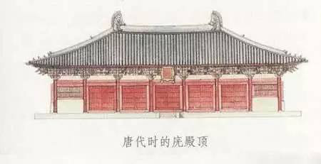 根據(jù)資料與記載,廡殿頂屋頂早在殷商時(shí)代就已出現(xiàn)。不過(guò),現(xiàn)在對(duì)唐代中期以前的廡殿式屋頂?shù)木唧w結(jié)構(gòu)已無(wú)從得知,晚唐以后漸有實(shí)例可查。其形象是屋面平緩,正脊較短。正脊兩端為鴟尾而不是鴟首。