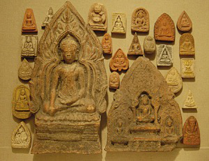 在泰國最北邊的城市清萊的一座古寺里,年長的僧人告訴我,在泰國,帕肯(“泰國擦擦”,泰語為“Phra-Kruang”,這個名詞在標準的泰文詞典里的解釋是:用于避兇消災的小型佛像,作用相當于護身符、祈愿物、供奉物。泰國的Phra-Kruang至今沒有一個公認的中文名稱,既然“擦擦”是譯音,我便挑了兩個最接近泰語Phra-Kruang發(fā)音的字給它:帕肯)的使用方式是這樣的:最早是在修建寺廟的時候放入佛塔內(nèi),因為古帕肯的內(nèi)容全是佛像,經(jīng)過高僧們開光后放入塔內(nèi)有增加靈氣的作用。百姓通常是到寺廟請回自己需要的帕肯回家供奉,或者作為還愿,出資請寺廟制作一定數(shù)量的帕肯,供奉在寺廟、家中或者贈送親友。
